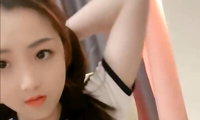 asiática juega con ella misma y simula botón de alegría con carne de hombre falso