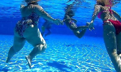 Girl/girl workout in pool of two BBW mommies Jessica and Gaborne