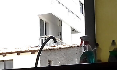 女仆通过酒店客人的窗户偷看,然后来到他的房间照顾他的公鸡