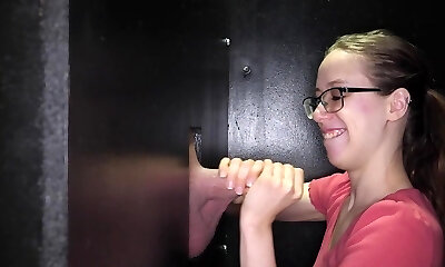 nena rubia con curvas en medias se mete en una habitación gloryhole, donde complace pollas con una habilidad loca