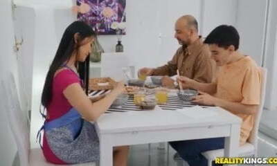 Light-haired teen fucked by her stepdaddy and by her stepbrother
