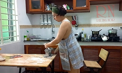 Ravioli Time! Naked Cooking. Regina Noir, a naturist cook at nudist hotel resort. Naked maid. Naked housewife. Teaser